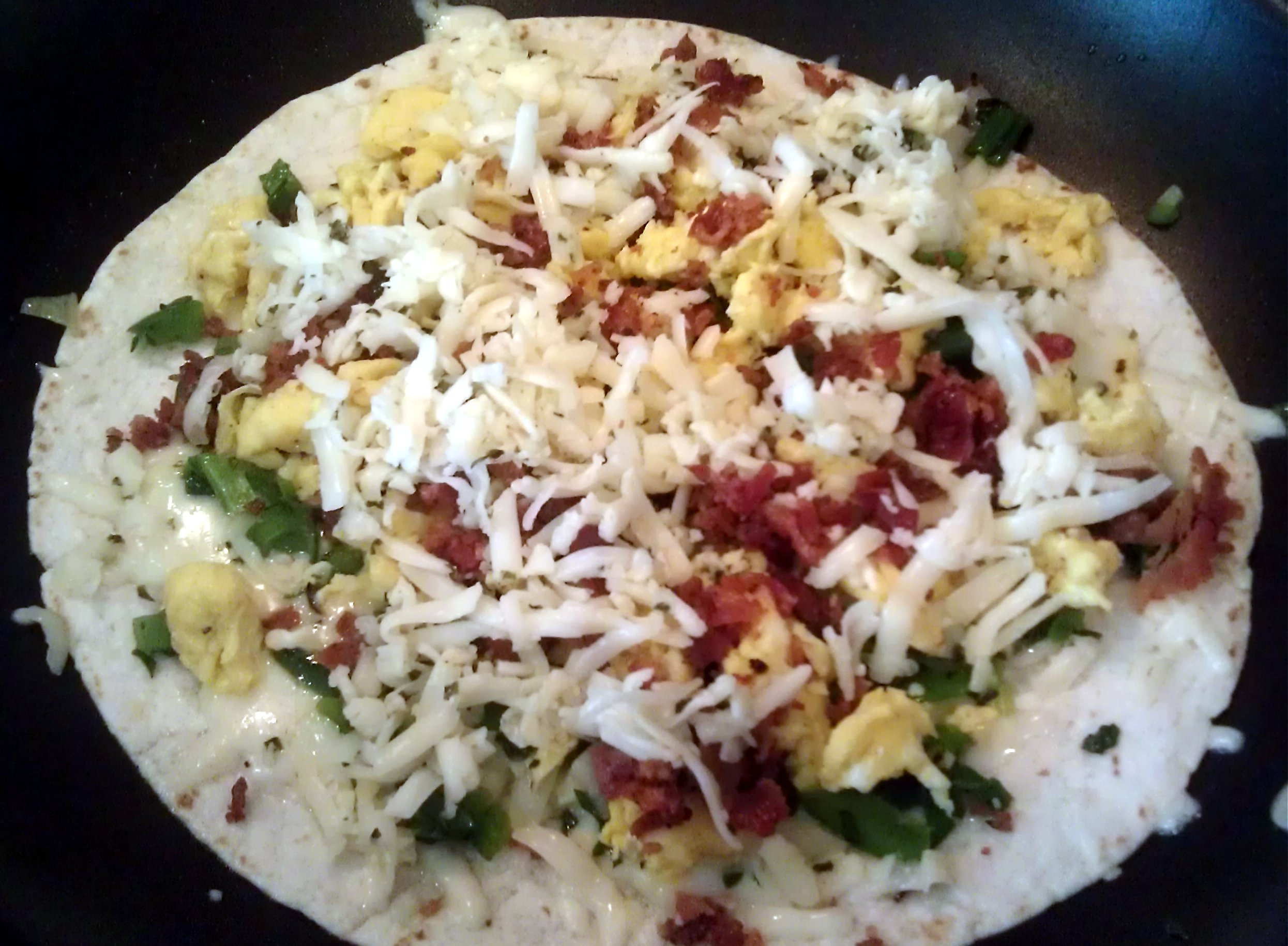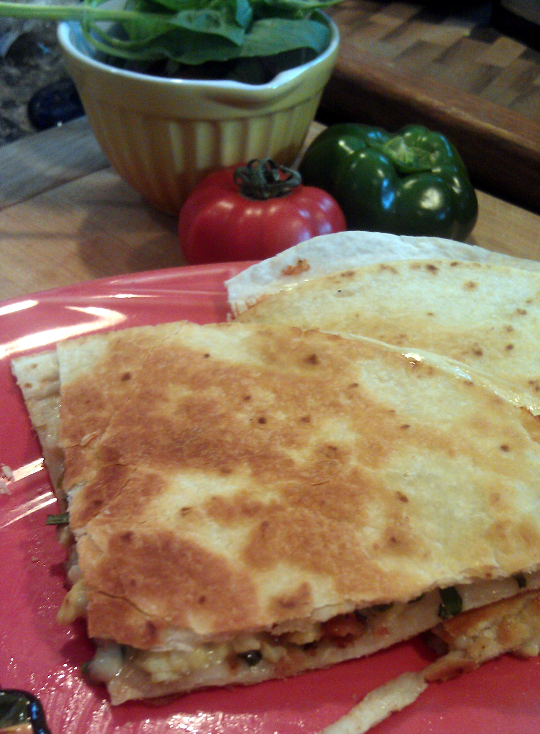As mentioned over at cheesemonger weblog, The Lady brought home three flavored Monterey Jacks cheeses made by Rocking W Dairy in Olathe, Colorado. We enjoyed the cheeses as a snack last night and this morning I awoke to the smell of bacon sizzling in the kitchen. Naturally I was interested and made my way to discover The Lady making quesadillas using the Rocking W Garlic Chives Monterey. She picked herbs from her herb garden, which is maintained by The Man along with tomatoes, onions, bell peppers and jalapenos from The Man’s garden. She suggested I share the recipe with you, my loyal readers. I also took pictures with her new Droid phone… no easy “feet” for a feline who lacks an opposable thumb…