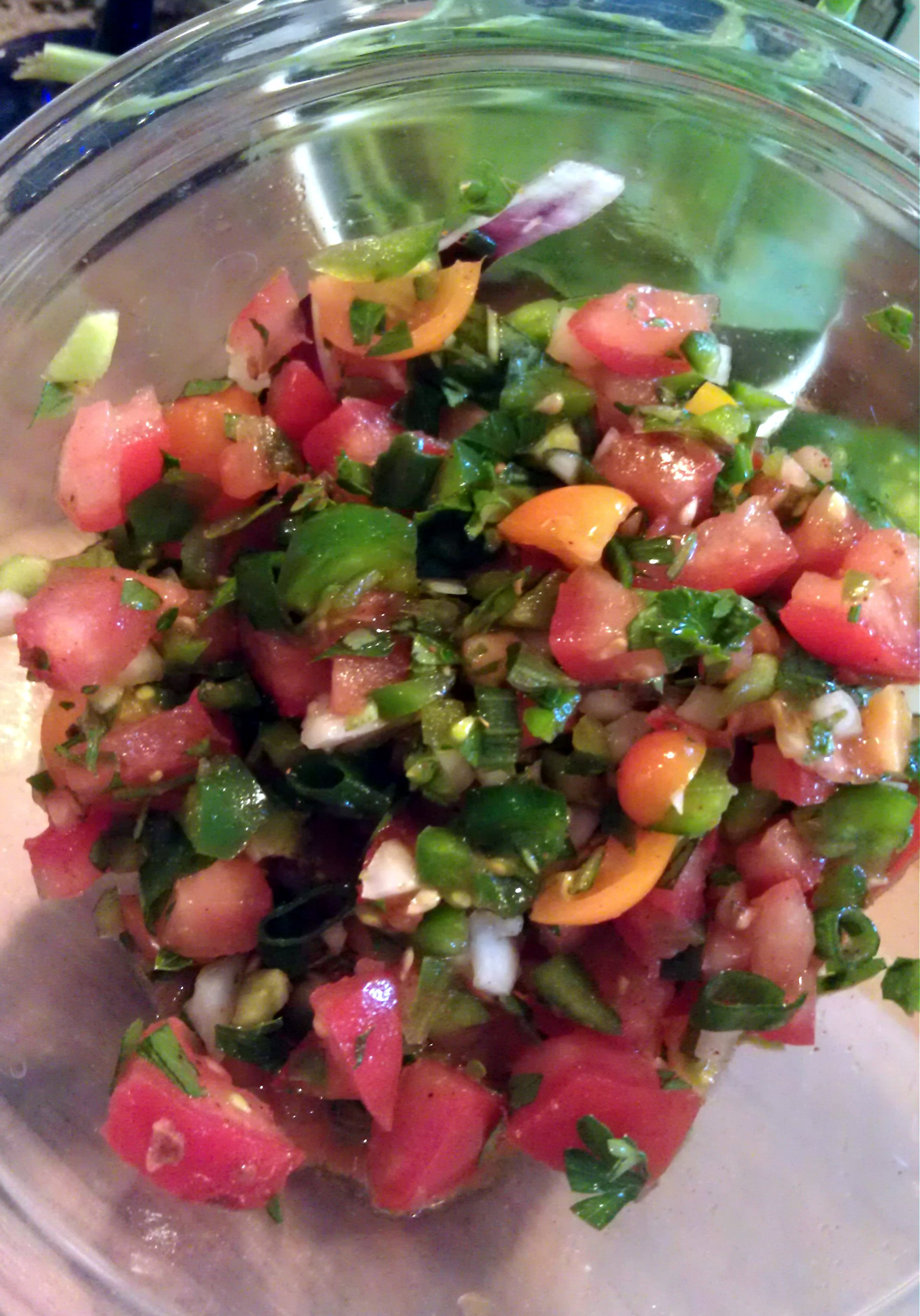Using a bit of olive oil, The Lady scrambled the eggs easy and lightly sautéed the veggies and herb. Then she built the quesadilla inside the sauté pans. She browned them on one side and flipped them to brown the other side. She served them with a Pico de Gallo she made from The Man’s garden bounty (recipe follows) and guacamole from the salsa bar at the Hawthorne Fred Meyer.